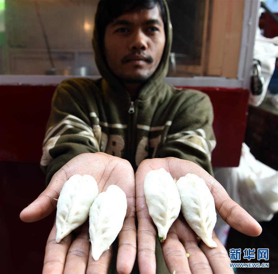 2月2日,在印度首都新德里一处街边小吃摊,一名男子展示包好的饺子。 印度街头的饺子摊很受民众喜爱,这里售卖的饺子多以素馅为主,洋白菜、鸡蛋和辣椒是主料,蒸熟后再佐以咖喱食用。每8个饺子为一份,价格约为人民币五元。 新华社记者 张迺杰 摄