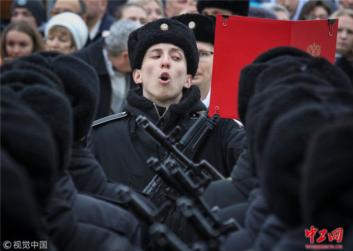 当地时间2019年2月2日,俄罗斯克里米亚塞瓦斯托波尔,俄罗斯黑海舰队的水手们在克尔松的圣弗拉基米尔大教堂前和切尔索尼索斯古城遗址前参加宣誓仪式。