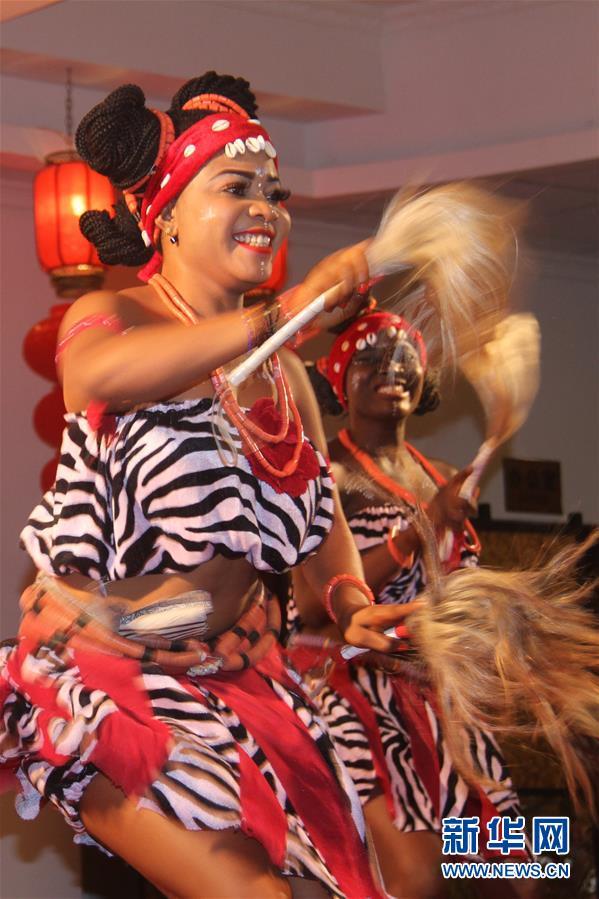 2月2日,在尼日利亚首都阿布贾中国文化中心,当地艺术团体在春节庙会活动上表演舞蹈。 尼日利亚中国文化中心2日举办春节庙会,丰富多彩的文艺活动和美食吸引了众多当地民众和在尼华侨华人。 新华社记者郭骏摄