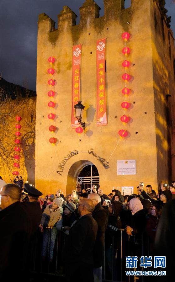 2月1日,民众聚集在摩洛哥“蓝色小镇”舍夫沙万老城中心广场,参加点亮红灯笼的仪式。新华社记者陈斌杰摄
