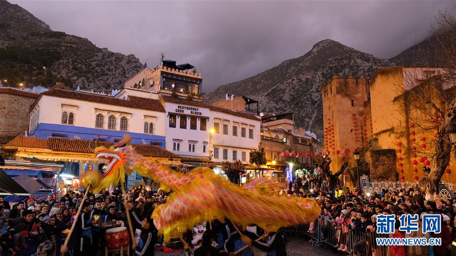 2月1日,在摩洛哥“蓝色小镇”舍夫沙万老城中心广场,演员表演舞龙。新华社记者陈斌杰摄
