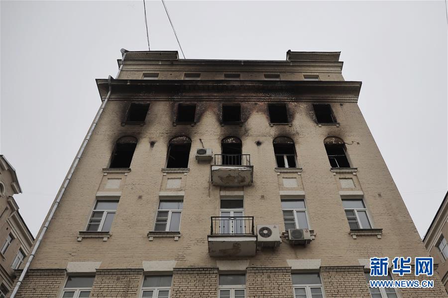 这是2月4日在俄罗斯首都莫斯科拍摄的发生火灾的居民楼。 新华社记者白雪骐摄