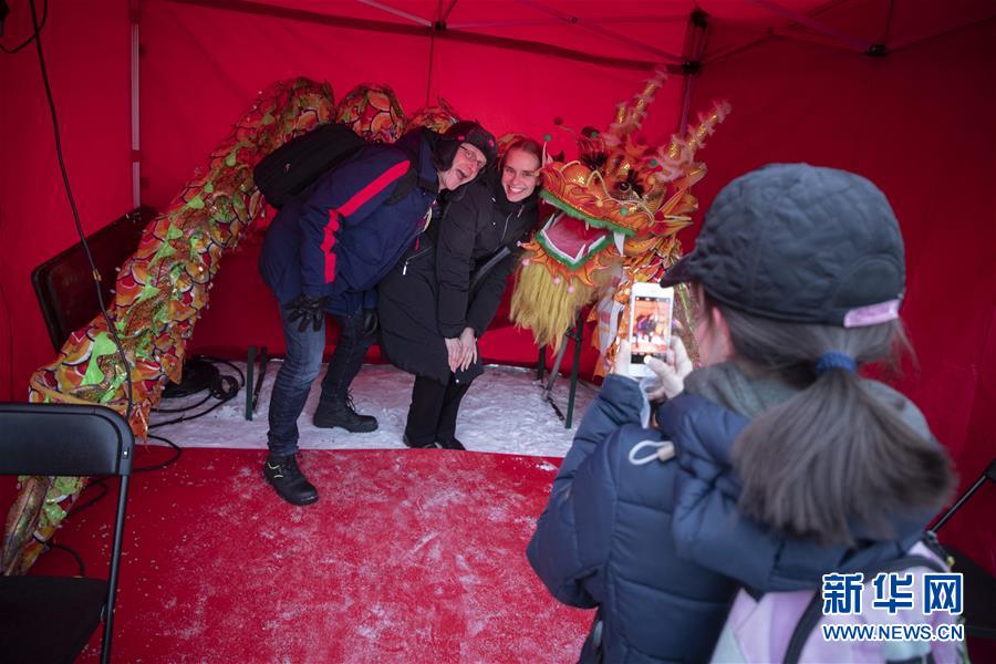 2月4日晚,在芬兰赫尔辛基,芬兰观众在赫尔辛基春节庙会上拍照留念。 新华社发(马蒂·马蒂凯宁摄)