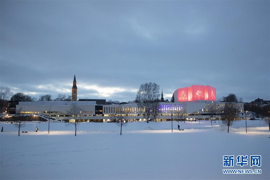 2月4日晚,在芬兰赫尔辛基,位于市中心的芬兰大厦被红色的春节彩灯照亮。新华社发(马蒂·马蒂凯宁摄)
