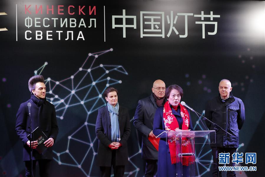 2月4日,在塞尔维亚首都贝尔格莱德,中国驻塞尔维亚大使陈波(前)在中国灯节开幕式上致辞,塞尔维亚总理布尔纳比奇(左二)出席开幕式。 新华社发(普雷德拉格·米洛萨夫列维奇摄)