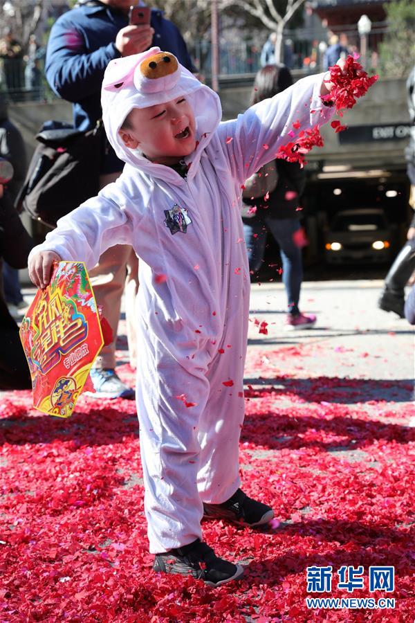 2月5日,在美国旧金山唐人街花园角广场旁,一名儿童在春节庆祝活动上玩鞭炮碎屑。 新华社发(刘艺霖摄)