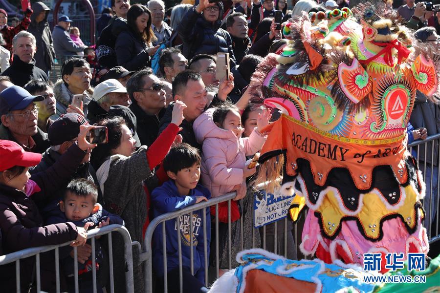 2月5日,在美国旧金山唐人街花园角广场旁,人们在春节庆祝活动上观看舞狮表演。 新华社发(刘艺霖摄)