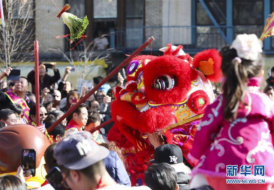 2月5日,在美国纽约曼哈顿下城,人们在春节庆祝活动上观看舞狮表演。 新华社记者王迎摄