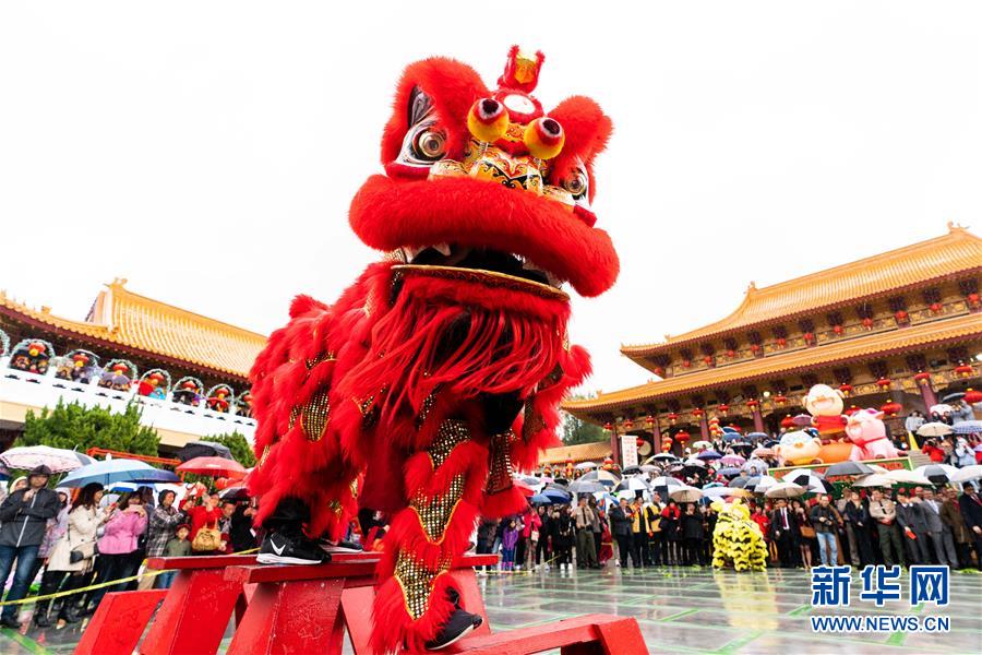 2月5日,在美国加利福尼亚州洛杉矶附近的西来寺,人们观看舞狮表演。 新华社发(钱卫忠摄)