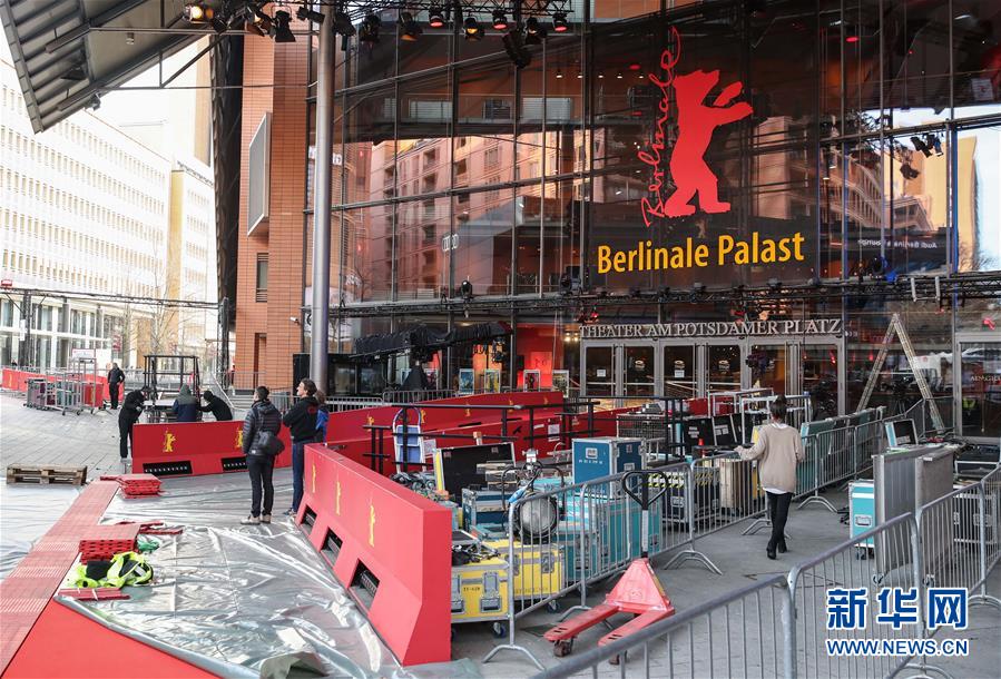 2月6日,在德国首都柏林,工作人员在第69届柏林国际电影节主会场柏林电影宫外布置。 第69届柏林国际电影节将于2月7日至17日举行。 新华社记者 单宇琦 摄