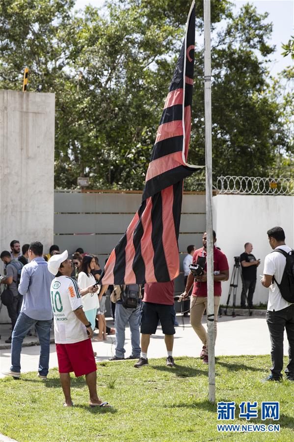 2月8日,在巴西里约热内卢州的巴西弗拉门戈俱乐部足球训练基地外,一名当地居民手握弗拉门戈俱乐部旗帜。 巴西里约热内卢州消防部门8日说,巴西弗拉门戈俱乐部足球训练基地当天凌晨发生火灾,至少造成10人死亡、3人受伤。 新华社记者 李明 摄