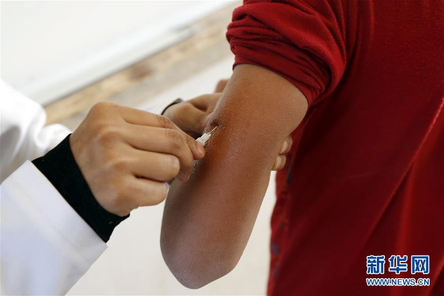 2月9日,在也门萨那,一名孩子接种麻疹疫苗。 据也门官方通讯社日前报道,也门2月9日开始为全国大约1300万6个月至15岁的少年儿童接种麻疹疫苗,该活动将持续6天。 新华社发(穆罕默德 摄)
