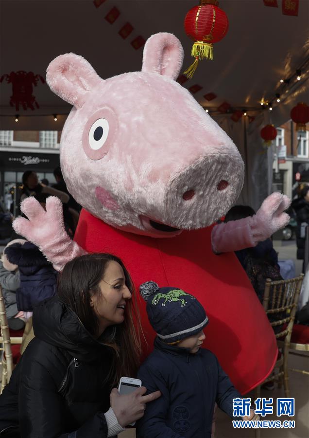 2月9日,在英国伦敦,一名装扮成“小猪佩奇”的演员与小朋友合影。 当日,伦敦约克公爵广场举行以“小猪佩奇”为主题的中国农历春节庆祝活动。 新华社记者 韩岩 摄