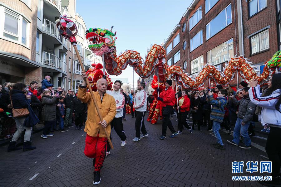 2月9日,在荷兰海牙,人们在庆祝活动中表演舞龙。 当日,海牙中国城、市政厅等地举办活动,庆祝中国农历春节。 新华社记者 郑焕松 摄