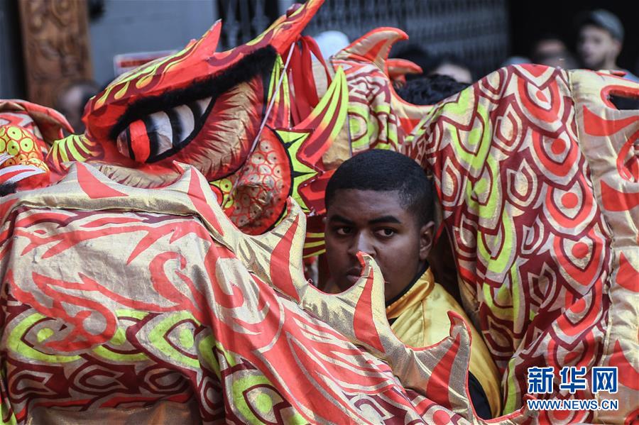 2月9日,在巴西圣保罗,一名巴西青年在庆祝活动中表演舞龙。 当日,圣保罗举行活动庆祝中国农历春节,人们在活动中表演舞龙舞狮并进行武术、书法等中国文化展示。 新华社发(拉赫尔·帕特拉索摄)