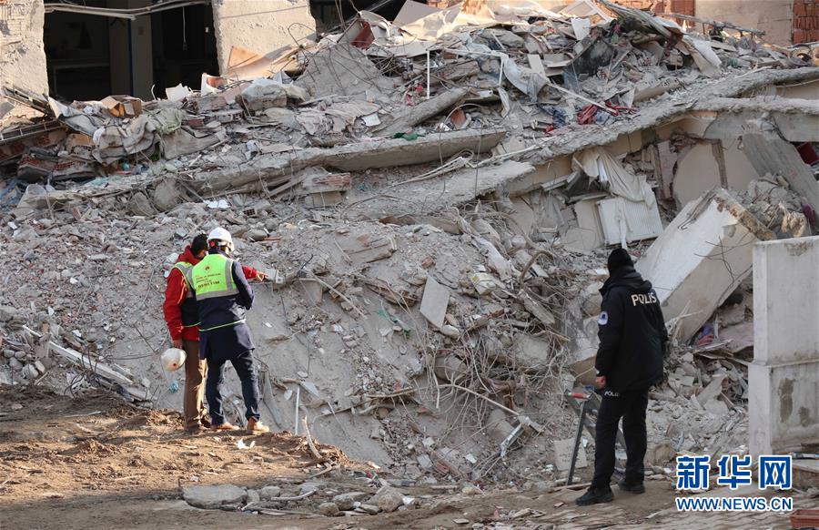 2月10日,在土耳其伊斯坦布尔,警察在居民楼倒塌事故现场执勤。 土耳其内政部长苏莱曼·索伊卢9日晚说,伊斯坦布尔市6日发生的居民楼倒塌事故已造成21人死亡、14人受伤。 新华社记者徐速绘摄