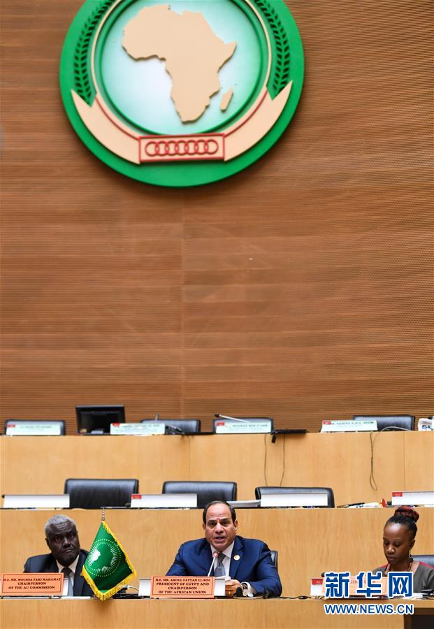 2月11日,在埃塞俄比亚首都亚的斯亚贝巴,新一届非盟轮值主席、埃及总统塞西(中)在非盟第32届首脑会议闭幕后的新闻发布会上发言。 为期两天的非洲联盟(非盟)第32届首脑会议11日晚在埃塞俄比亚首都亚的斯亚贝巴非盟总部闭幕,会议聚焦难民和非洲人流离失所问题。 新华社记者 李琰 摄