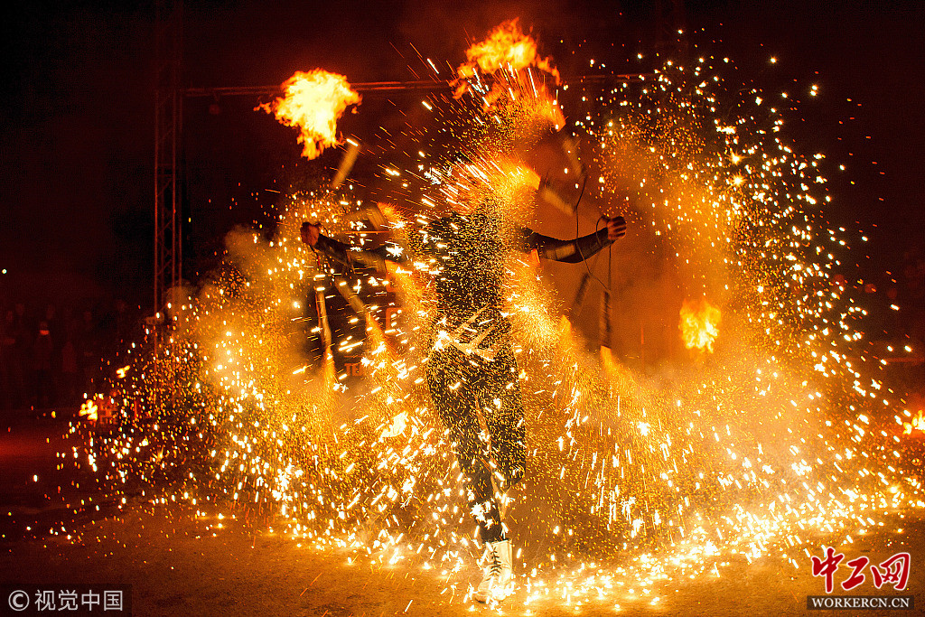 2019年2月10日,乌克兰西部乌日赫罗德,舞蹈演员在帕拉钦塔节闭幕式上进行传统篝火表演,与游客一起告别冬天,迎接春天。