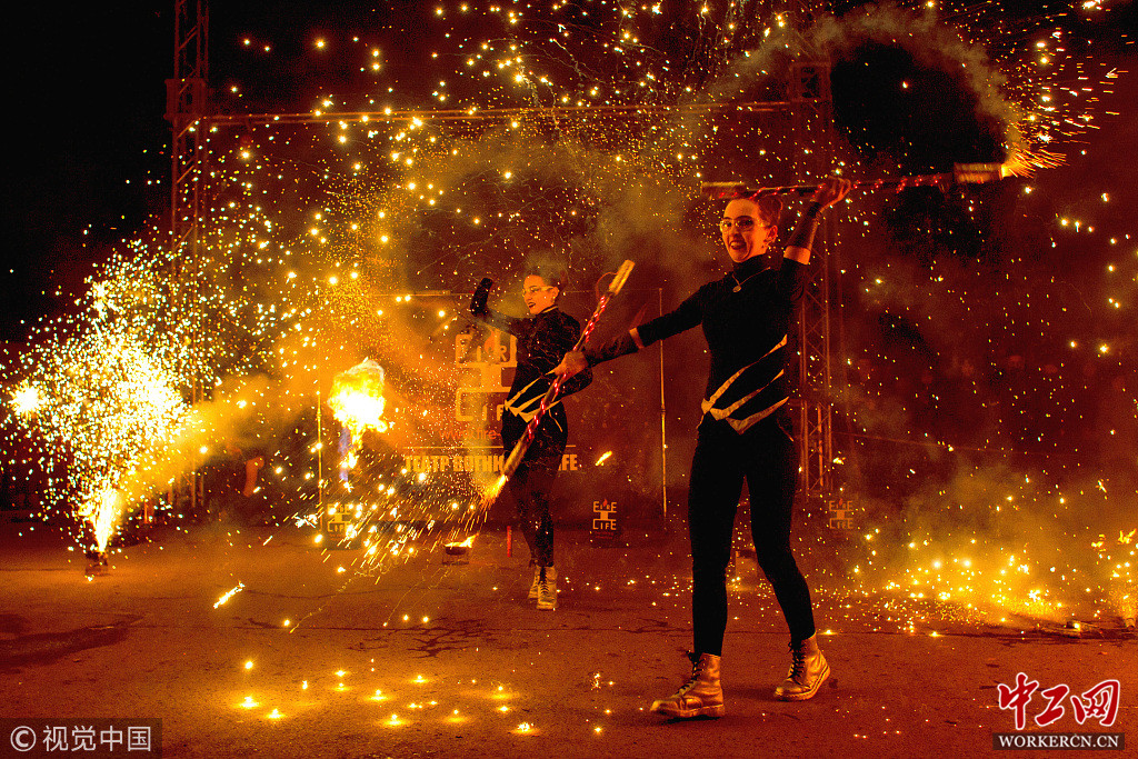 2019年2月10日,乌克兰西部乌日赫罗德,舞蹈演员在帕拉钦塔节闭幕式上进行传统篝火表演,与游客一起告别冬天,迎接春天。