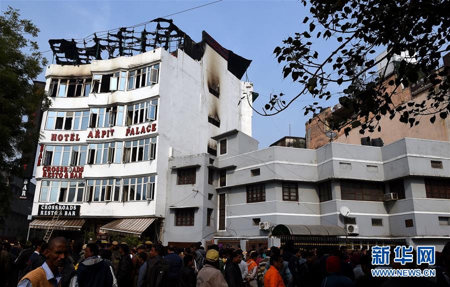 2月12日,在印度首都新德里,人们聚集在发生火灾的酒店周围。 据印度媒体报道,印度首都新德里一家酒店12日发生大火,目前已造成17人死亡,另有5人受伤。 新华社记者张迺杰摄