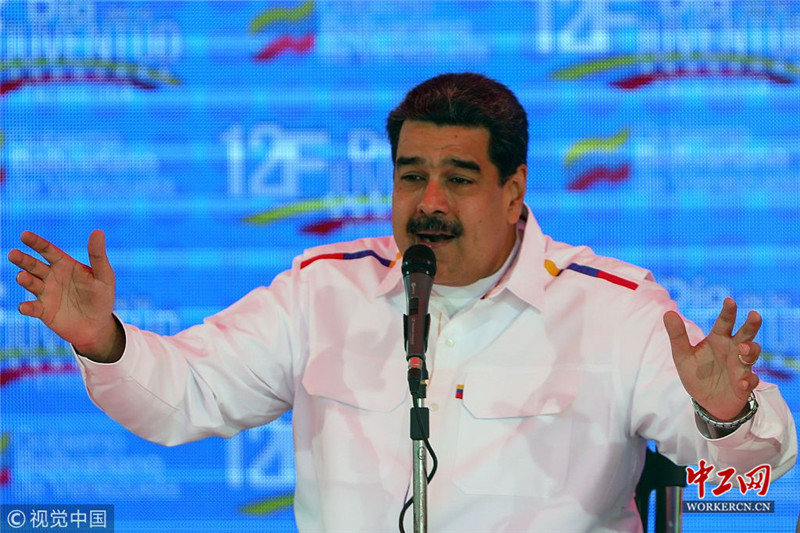 当地时间2019年2月12日,委内瑞拉加拉加斯,委内瑞拉总统马杜罗在加拉加斯玻利瓦尔广场举行的“青年节”庆祝活动上发表演讲。图片作者:Anadolu Agency/视觉中国