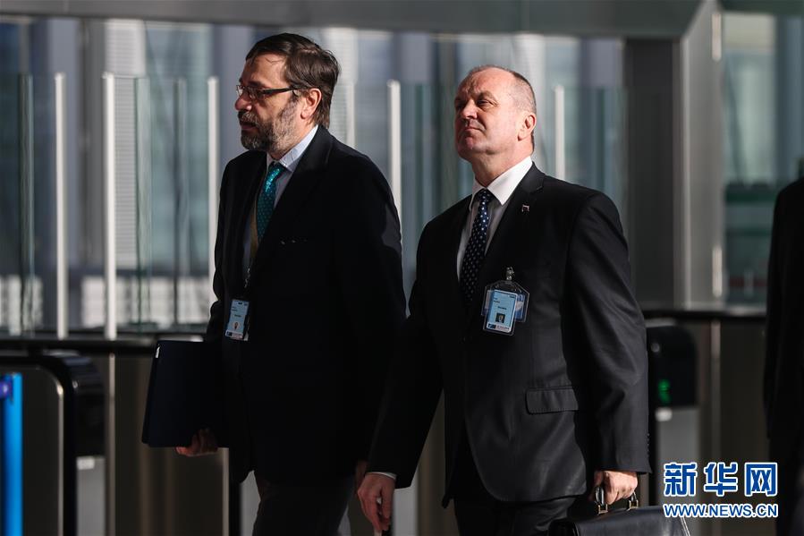 2月13日,斯洛伐克国防部长盖多什(右)抵达在比利时布鲁塞尔的北约总部。 北约国防部长会议当天在位于比利时首都布鲁塞尔的北约总部举行。 新华社记者郑焕松摄