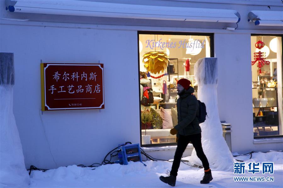 2月13日,在挪威北部小镇希尔克内斯,一名男子从一间挂有中文招牌的商店前经过。 13日,以“世界最北端的中国城”为主题的2019年巴伦支盛典活动在希尔克内斯开幕。为期5天的巴伦支盛典是希尔克内斯从2004年开始举行的年度跨境庆典活动,今年以中国为主题。 新华社记者梁有昶摄