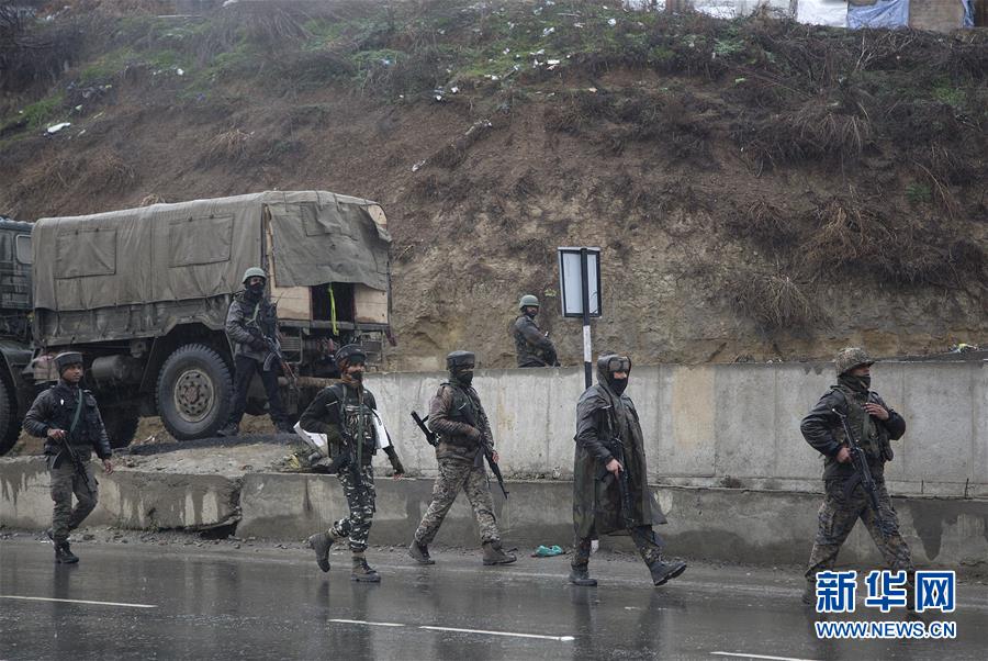 2月14日,在印控克什米尔首府斯利那加以南的普尔瓦马地区,印度士兵在袭击现场附近警戒。 新华社发(贾维德·达尔摄)