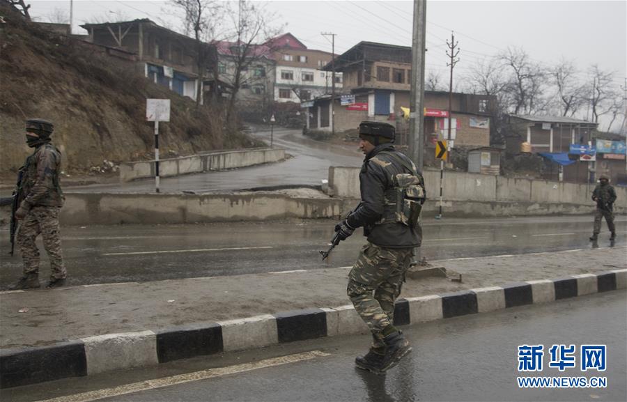 2月14日,在印控克什米尔首府斯利那加以南的普尔瓦马地区,印度士兵在袭击现场附近警戒。 新华社发(贾维德·达尔摄)