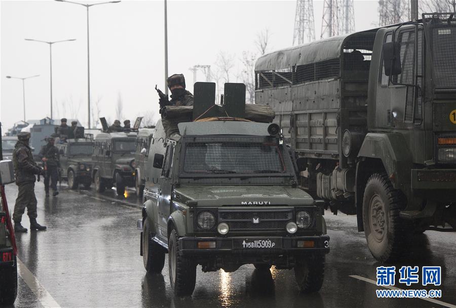 2月14日,在印控克什米尔首府斯利那加以南的普尔瓦马地区,印度士兵在袭击现场附近警戒。 新华社发(贾维德·达尔摄)
