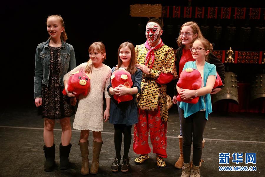 2月14日,在美国马斯卡廷,当地观众在演出结束后与扮演孙悟空的中国国家京剧院演员合影。 2月14日,美国中部小城马斯卡廷,呈现出浓郁的节日气氛。当晚7时许,马斯卡廷中央中学礼堂,座无虚席。由湖北省歌剧舞剧院编钟国乐团和中国国家京剧院一团的艺术家们联袂奉献的“欢乐春节”大戏在这里上演…… 新华社记者汪平摄