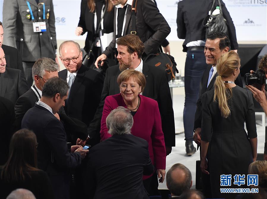 2月16日,在德国慕尼黑,德国总理默克尔(中)出席慕安会。 在德国南部城市慕尼黑举行的第55届慕尼黑安全会议进入第二天。 新华社记者逯阳摄
