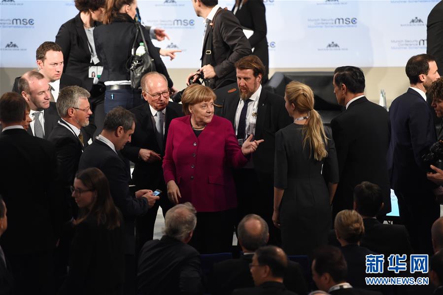 2月16日,在德国慕尼黑,德国总理默克尔(中)出席慕安会。 在德国南部城市慕尼黑举行的第55届慕尼黑安全会议进入第二天。 新华社记者逯阳摄