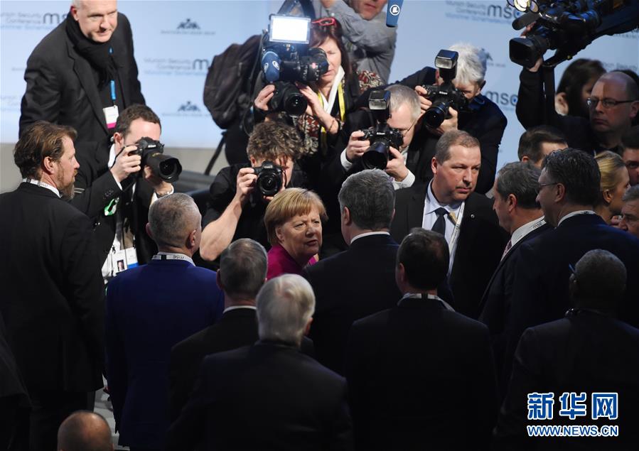 2月16日,在德国慕尼黑,德国总理默克尔(中)出席慕安会。 在德国南部城市慕尼黑举行的第55届慕尼黑安全会议进入第二天。 新华社记者逯阳摄