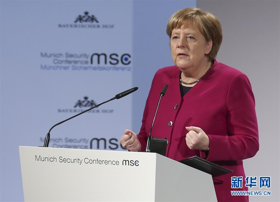 2月16日,在德国慕尼黑,德国总理默克尔在慕安会上发言。 在德国南部城市慕尼黑举行的第55届慕尼黑安全会议进入第二天。 新华社记者叶平凡摄