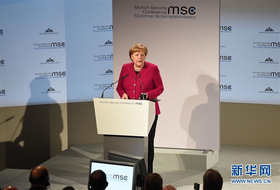 2月16日,在德国慕尼黑,德国总理默克尔在慕安会上发言。 在德国南部城市慕尼黑举行的第55届慕尼黑安全会议进入第二天。 新华社记者逯阳摄
