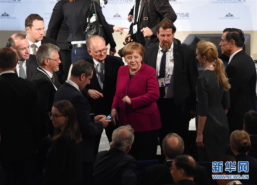 2月16日,在德国慕尼黑,德国总理默克尔(中)出席慕安会。 在德国南部城市慕尼黑举行的第55届慕尼黑安全会议进入第二天。 新华社记者逯阳摄