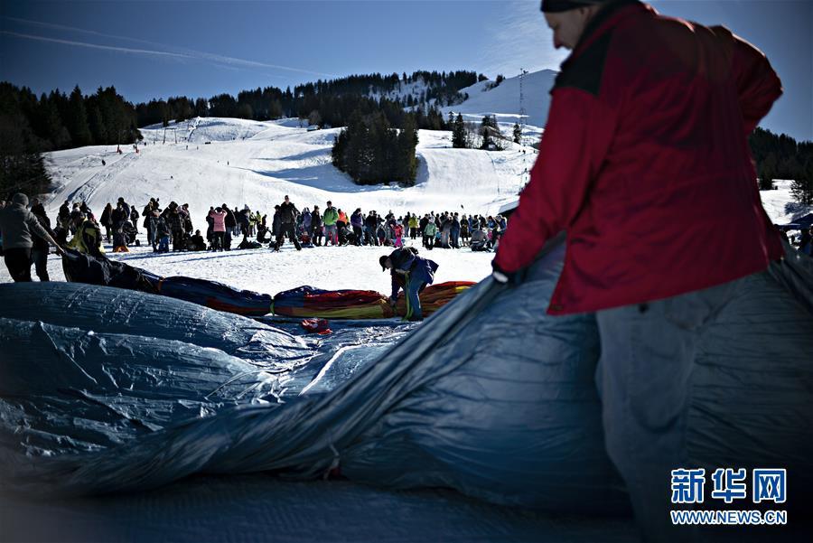 2月17日,在瑞士萨特尔,人们准备放飞热气球。 当日,瑞士萨特尔举办热气球节,吸引了众多游客参观。 新华社发(米歇尔⋅立米纳摄)