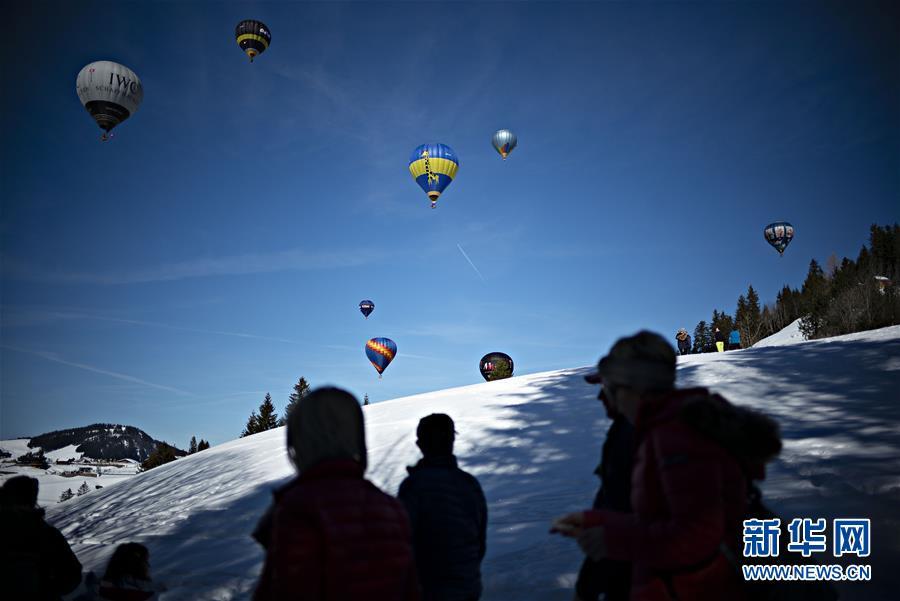 2月17日,在瑞士萨特尔,人们观看放飞的热气球。 当日,瑞士萨特尔举办热气球节,吸引了众多游客参观。 新华社发(米歇尔⋅立米纳摄)