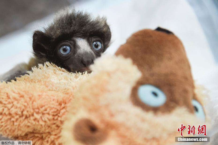 马达加斯加濒危冠冕狐猴宝宝亮相 抱着玩偶不撒手