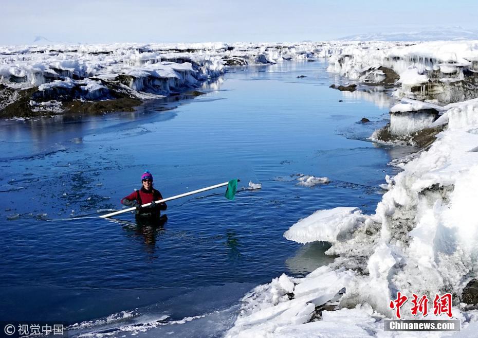 新的研究警告说,地表湖泊正在导致南极冰架在大量融水的重压下弯曲,这可能威胁到它的稳定性。融水湖可以容纳5万到200万吨的水,这些水向下推动冰形成凹痕。研究人员预测,如果合成应力足够大,融水湖周围的冰就有可能开始破裂。图片来源:视觉中国