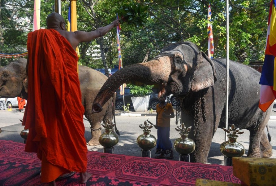 2月18日,在斯里兰卡科伦坡,僧侣为一头大象赐福。斯里兰卡首都科伦坡18日迎来了一年一度的传统节日“纳瓦姆月圆节”,一场持续两天的盛大游行表演在科伦坡街头上演,每年的游行活动都会有数十头大象前来参加。新华社\/法新