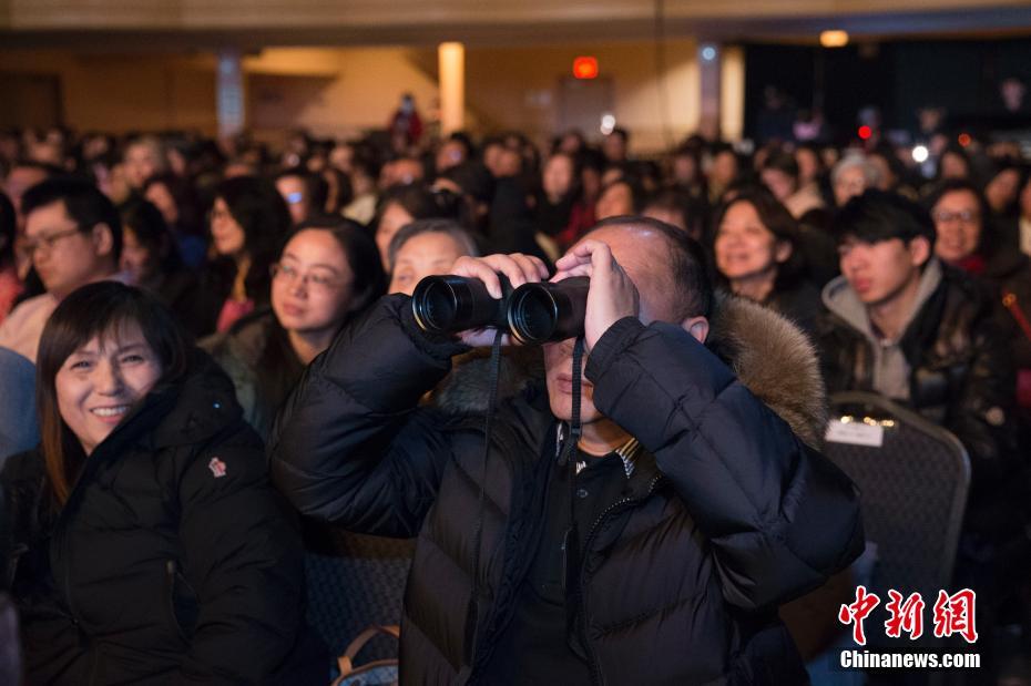 图为华人观众万先生使用望远镜观看演出。中新社记者 廖攀 摄