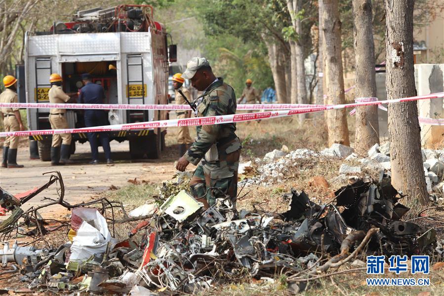 2月19日,在印度班加罗尔,军人在坠机现场查看。新华社发