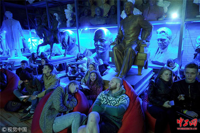 当地时间2015年5月16日,白俄罗斯明斯克年度博物馆之夜,雕塑家扎尔·阿兹古尔纪念博物馆内,人们坐在前苏联领导人弗拉基米尔·列宁和约瑟夫·斯大林的雕像旁。