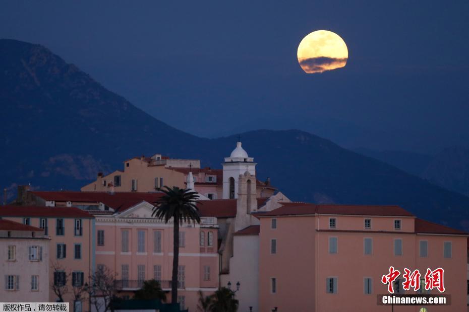 一轮“超级月亮”在法国地中海科西嘉岛的阿雅丘上空升起。