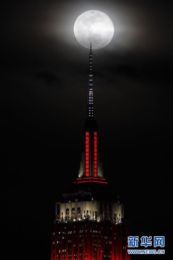 这是2月19日在美国新泽西州霍博肯拍摄的月亮从帝国大厦上空升起的景象。