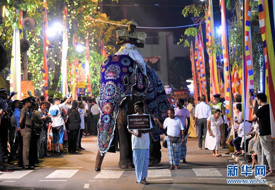 2月18日,在斯里兰卡首都科伦坡,身披深蓝色花纹镶边织物的“坎贾纳”作为“领头象”第一个在观众面前亮相。 位于斯里兰卡首都科伦坡市中心的贝拉湖畔平日里行人不多、十分安宁。不过,在每年2月佛教节日“纳瓦姆月圆节”期间,这里都会因一些远方“贵宾”安营扎寨而失去以往的宁静,它们就是受邀参加月圆节游行的几十头大象。 新华社发(伊沙拉·科迪卡拉 摄)