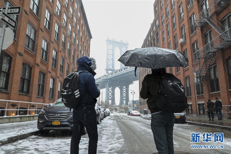 2月20日,在美国纽约曼哈顿大桥附近一商业区,两名男子在雪中观赏风景。