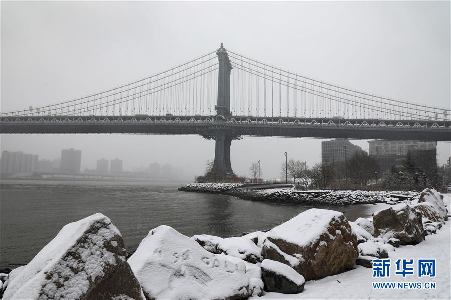 这是2月20日拍摄的雪中的美国纽约曼哈顿大桥。